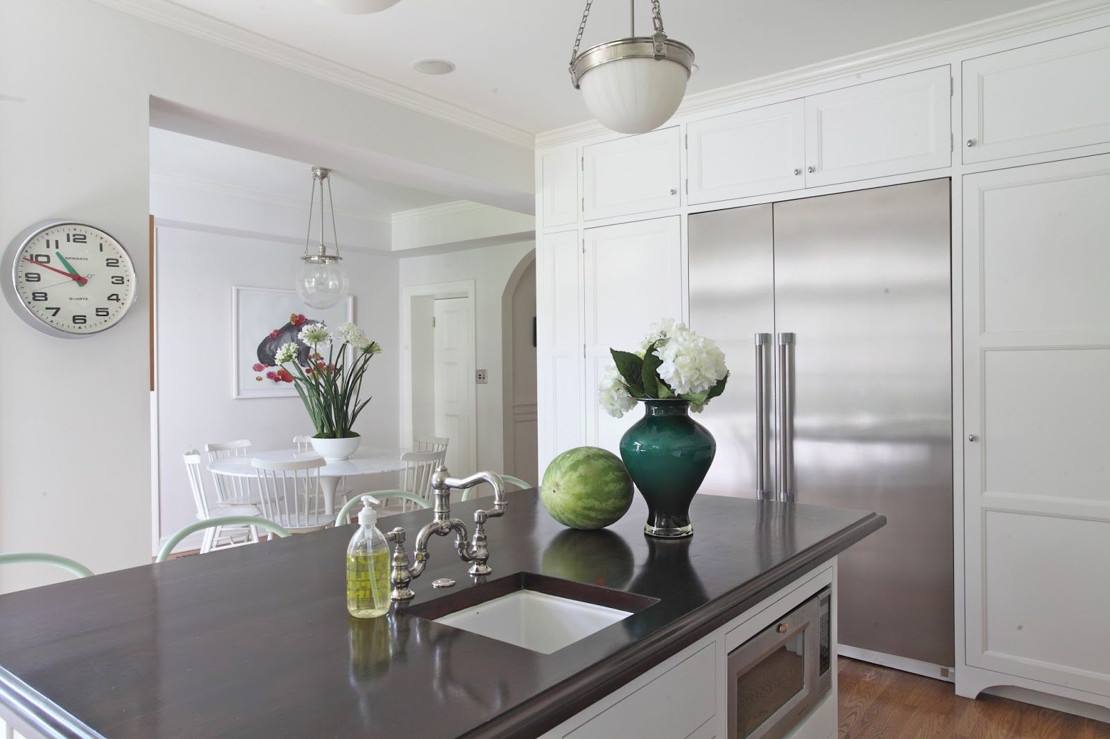Thonet's iconic mid-century bentwood stools (above) at the kitchen island got a coat of soft mint (Ben Moore's "Kittery Point Green), and the timeless yet modern Windsor style chairs around a marble Saarinen-style tulip table went from black to white and had their feet "dipped" in the same mint color. I wrote about DIY dipped furniture here.