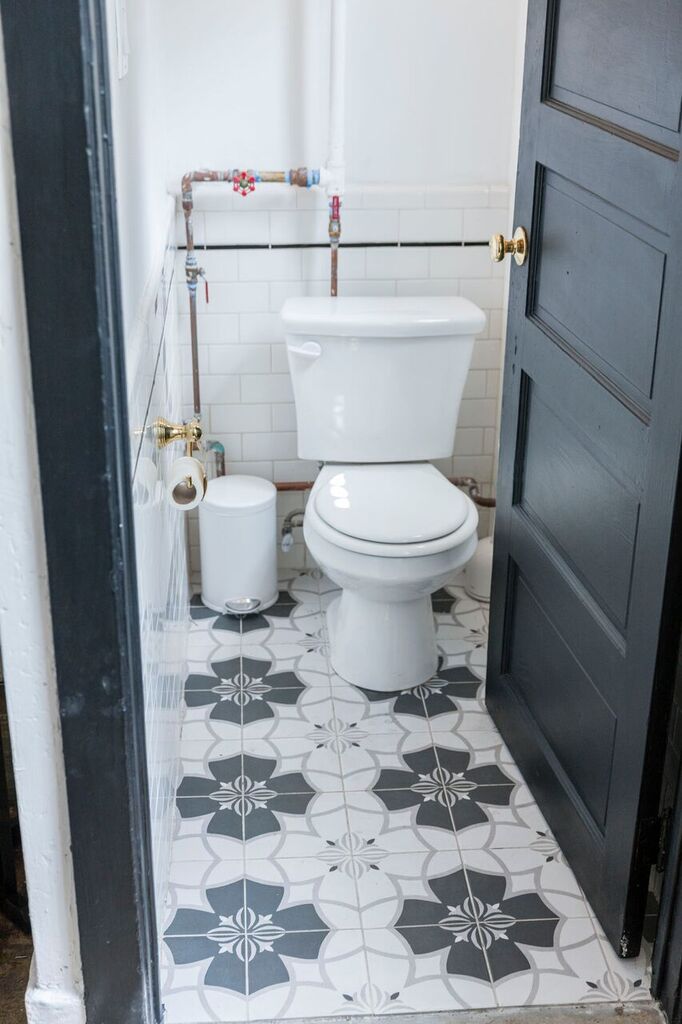 looks like authentic encaustic cement tile but cost way less. The walls got a wainscot of white subway tile with a thin black pencil trim chair rail. Painting the bathroom door and window black gave it a shot of drama and contrasting brass hardware provided the finishing touch. It's simple and utilitarian, but also classic and pretty.